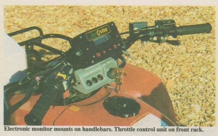 The actual speed control unit consists of an electric "servo" unit that mounts on the front carrier rack. A steel cable runs from it to the throttle. The electronic monitor on the handlebars sends signals to the servo, which makes adjustments automatically. There's a sensitivity adjustment on the unit which lets you adjust for varying field conditions.