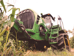 “The system uses the combine’s tow hook but applies the majority of force to the front axle, which allows the combine to be pulled out backward at an angle without the cable interfering with the rear wheels,” says Brutlag.