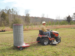 This new 2-wheeled “fencing trailer” makes it easy for one person to lift a roll of woven wire fence upright and unroll it for attachment to posts.