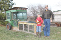 Matthew only needed space for three hens so the old cab from a 5020 Deere tractor was plenty big enough to house them. Along with scrap 10-ft. timbers, some wire, and tires off a flail mower frame, the Bauers built a mobile coop that rolls easily enough to move to a new spot every day.