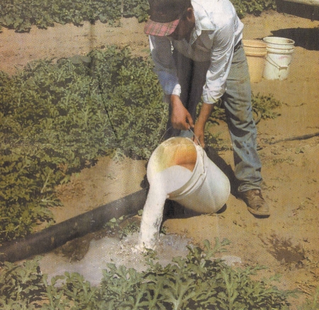 poured onto the roots of crops as they near maturity. Workers pour 5-gal.