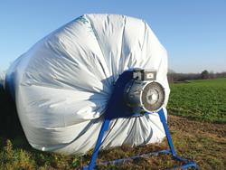 The Air Barn system consists of the bagger frame, fan, fan stand, and bag. The operator uses a front-end loader to load bales into the loader’s bale chamber, and then uses the loader bucket to pull the bagger backward to make room for more bales. The process is repeated until the tube is filled, and then the finished end of the bag is closed to the desired diameter to control air flow.