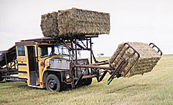 Once a bale is placed on the bed, the clamps release and are returned forward for another bale. The cycle is repeated until a full load of bales are in place on the truck. Then the flatbed over the cab elevates to about 30 degrees, allowing the bales on top to slide back to the end. Once a load is completed, the bales are stacked on their edges instead of on their string sides which keeps the stack more stable. Or, the tailgate can be lowered to allow bales to slide to the ground.