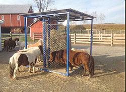 The base model small square bale holder that bolts to a wall sells for $795 plus S&H. The base unit with trough extension, legs and roof sells for $1,040 plus S&H. The round bale holder sells for $2,095 plus S&H.