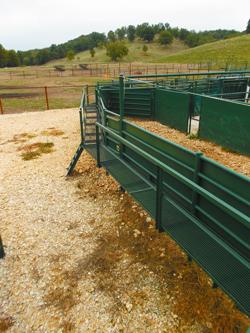 The catwalk is about waist high off the ground and is fitted with stepladders and handrails along the entire length of the catwalk for operator safety. The walkway is made from welded bar grating, and the handrails are made from angle iron welded to channel iron posts. Bracing is welded to 4 1/2-ft. upright metal posts to further stabilize the catwalk. The sides of the corral are solid sheet metal, so livestock can't see the lower half of the handler on the catwalk. The entire catwalk system is painted green.
