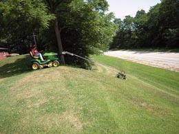 "It's easy to operate and safe to use," says Lake. "I use my Deere X758 4-WD diesel riding mower equipped with a hitch on front. I cut a full strip on the way down, and cut as much unmowed grass as I can on the way back. It's a lot easier than mowing the hill by hand, and I don't have to worry about tipping over."