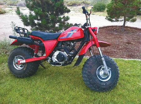 "After seeing a couple of other 3-wheeler to 2-wheeler conversions, I took what I considered to be the best approach and turned a couple of 1980's Honda Big Reds into a nice running, fat-tire bike," says Seline. "I purchased the two "basket case" 3-wheelers for a couple hundred dollars and figured a dirt bike conversion would be the best use for them. The bike handles great and is easy and fun to ride in the soft sand around our desert area."