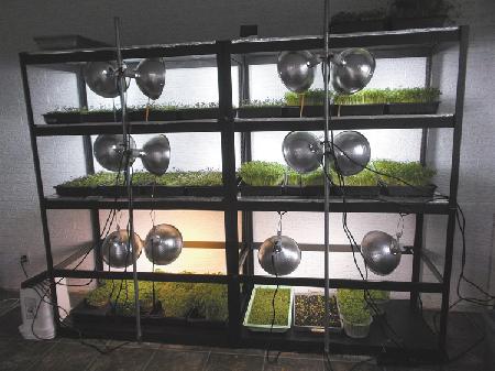 The microgreens at Blue Heron Farm are propagated in an indoor growing room with windows and grow lights. The environment in the growing room must be constantly monitored and adjusted in order to achieve adequate production - "You have to control the conditions precisely to the best of your ability," says James. Humidity is especially important. During the early stages of germination, the growing room needs to be kept at 80 percent humidity. But once the microgreens are in a more developed stage of growth, the humidity must be reduced to below 50 percent, or mold and rot can occur. James uses misters and a thermostat to regulate the humidity.