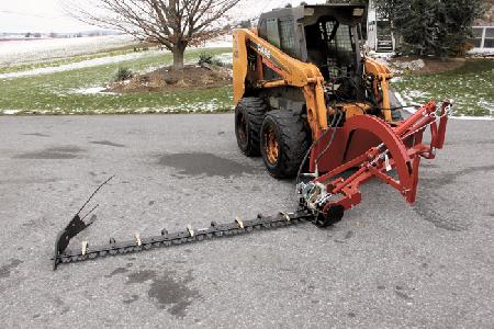 “A hydraulic cylinder controls the angle of the cutting bar,” says Blank. “You could shear a tall hedge with it and mow the top or trim the side of a tree or bush. It can mow anywhere the loader arms position it.”