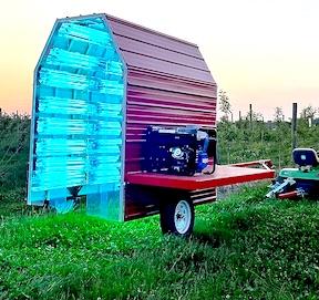 The team built a UV-C device collaboratively with their colleague, David Gadoury. The towable arch on wheels is lined with UV-C bulbs emitting germicidal ultraviolet light. An array of reflectors causes a reflective light cloud to reach the underside of the leaves and the canopy interior.