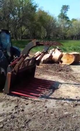 “I tip the bucket forward and then close the grapple as I tip it back to pick up the brush,” says Volk. “When loading blocks, the tines slip underneath, and the grapple comes down. It holds the blocks so I can lift them away on the tines rather than bending some linkage.”
