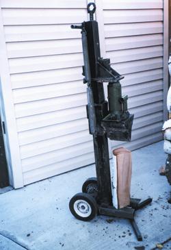 An 8-ton bottle jack, attached to the top of the wedge, powers the splitter. The jack pushes down against and adjustable stop at the top of the frame. A 7/8-in. bolt holds the stop in place, depending on the size of the log.