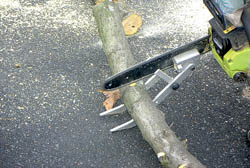 If you've ever used a chainsaw to cut downed wood or limbs on the ground, you know it can be a frustrating job. This new attachment lifts the wood for cutting, keeping the chain up out of the dirt.