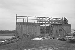 "There is a lot of elbow grease involved in taking down a barn if it's done right," he says. "In dismantling a barn, you do it in reverse order to assembly -- taking off the roof, then the purlins and siding. We use a crane to take down the superstructure. It's dangerous work and involves a lot of equipment and labor."