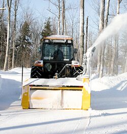 "The impeller is located at one end of the machine instead of the center, so the entire auger rotates in the same direction unlike blowers with a center-mounted impeller which has two augers going in different directions. As a result, the machine requires less power to operate and is also more fuel efficient," says Robert. "This machine really comes in handy for clearing snow from narrow spaces between buildings, where you can't blow snow to the left or right or backward. You simply rotate the discharge chute to blow the snow forward, in front of the tractor."