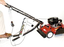 The attachment requires no tools to install and no modifications to the mower or engine. It attaches to the mower handle with four adjustable clamps. The pull cord is fed through a series of pulleys which provide the leverage to easily pull the cord.