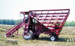 He says the box holds 65 to 70 bales. When it's full, he drives to the hay barn and opens the tailgate. "They slide out because the floor is slanted and slick," he says. "My barn holds more hay than I can use, so I usually don't bother stacking the bales. I just run them up the elevator and let them drop. With this system, I only have to handle the hay once - when I put the bales on the elevator."