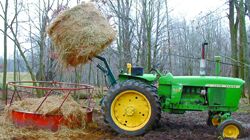 "I use it on my Deere 4010 tractor and couldn't be happier with it," says Hicks. "I got the idea when I priced a new front-end loader. My 3-pt. bale lift is easier to mount than a loader, and it keeps the traction and weight on the rear wheels so the front wheels don't have to plow through mud and snow. I also have a better view of the bale as I spear it than I would with a loader. It's built strong -- I've used it to lift 1,000-lb. bales."