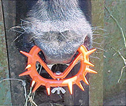 The EasyWean NoseRings are easy to remove and are made of high quality acetyl so they can be reused. Richardson ships them to the U.S. and offers discounts for larger orders. She also has smaller EasyWean NoseRings for sheep and goats.