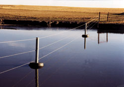 Foot says the posts can be spaced out across a wet area like a slough or even across a lagoon or dugout, and barbed wire can be stapled to the posts. The weight at the bottom of the post holds it down and allows it to settle into the mud if the water level drops low enough. Once the water comes up again, the float raises the post, keeping the wire in place above the water. If there's likely to be a lot of moving water, Foot runs a 3/16 wire cable from post to post, anchoring them to a solid T-brace on each side of the water. The bracing is necessary to keep the flexible floating part of the fence from loosening the rest of the fence when it moves.