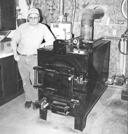 This home-built hot water furnace has served Roger Foster well for several years. Overall length is 5 ft. long. The firebox will take up to a 3-ft. log and it's 2 ft. wide. There's a water jacket on the top and sides of the fire box which holds 2 1/2 in. of water. Water is heated by the fire and then travels to a 200-gal. reservoir where it circulates through 120 ft. of 1-in. copper pipe. Heated water in the pipe transfers its heat to the water in the reservoir. Then the heated water in the reservoir circulates to the rooms and radiators.