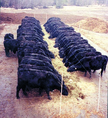 "We used to use round bale feeders but the cattle would throw hay out of them, wasting a lot of feed. We started looking at using some sort of concrete feeder but they were expensive and hard to clean," says Ed Walder, Wittenberg, Wis. "Finally we thought of this idea and I can't imagine a better way to feed cattle. The idea consists simply of two electric lines spaced about 4 ft. apart and positioned 3 1/2 ft. high. We dump feed in the middle. If cattle start pushing the feed around, it just gets pushed over to the cow on the other side. So there's virtually no waste. "Clean-up is easy with a skid steer loader and you can set this up anywhere -- in a feed-lot on a concrete pad or out on pasture. We already had a fence charger."