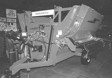 You can shred any round bale, no matter its size, shape, or condition, with this first-of-its-kind bale shredder, says Westward Produgts, Jamestown, N. Dak. The two-wheeled, pto-driven "Jiffy" bale shredder is designed to load itself with one bale and carry another one and is equipped with a separate steel rocking cradle that mounts inside the tub. The cradle is rocked back and forth by a pair of two-way hydraulic cylinders mounted on front of the tub. As one cylinder is extended, the other retracts to move the cradle in one direction. The direction of the cradle is reversed as soon as a steel arm contacts a stop. The bale rides over a big shaft equipped with steel knives that runs lengthwise along the bottom of the tub. The shredded hay is thrown out in a pattern up to 45 ft. wide or you can lower a shield to direct the hay into a windrow on the ground. An optional grain feeder can be mounted on one side of the tub and used to discharge grain on top of the hay windrow at the back of the machine. "It'll handle any type of bale, including round and small or big square bales, including high moisture bales which are often uneven in shape. The condition of the bale doesn't matter," says Scott Waldie, sales manager. "Other shredders have trouble dealing with bales in unfavorable condition which prevents them from being shredded. It'll even shred frozen bales. The bale gets shredded off on one side only, so if the outside of the bale is rotten it will get mixed in with the good hay a little at a time instead of all at once. That way the animals will eat it all up. Another advantage is that it doesn't have any gearboxes, chains, or belts to maintain. "It was developed in Alberta where a lot of bales end up frozen to the ground. As a result the loading forks are designed with a lot of lifting capacity and don't have any problem jerking frozen bales off the ground."