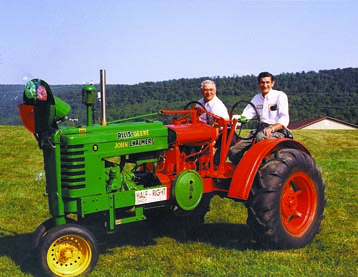 "It gets a lot of looks wherever we go," says Steve Grieb, Centre Hall, Penn., about the "half right" tractor that he and friend Paul Dotterer built. The front half of the tractor is a 1940's Deere B and the rear half is a 1940s Allis-Chalmers WC. The tractor is owned jointly by Grieb -- a Deere dealer -- and Dotterer -- formerly an Allis-Chalmers dealer. It has two seats -- a green one and an orange one; two steering wheels -- one green and one orange; and a homemade bubble machine on front. The steering wheels are tied together with sprockets and chains, allowing the tractor to be driven by either one or two drivers. The centrally-located hand clutch and throttle are accessible from either seat, as are a pair of hand brakes. The original Deere 2-cyl. engine was replaced with one from the LUC power unit off a 1940's Deere combine. The engine is connected to the Allis transmission. "We take it to a lot of steam engine shows and often drive it in parades. People take a lot of photographs of it," says Grieb. "A lot of people who are familiar with equipment really appreciate it, but the average person thinks that we bought it. Paul and I have been friends for years and built it just for fun. Since I'm a Deere dealer he says that I'm not allowed to sit in the orange seat. We did the work during evenings and weekends. We fabricated a clutch and pressure plate for the fly-wheel and mounted a hand clutch. The original Deere B had a hand clutch, too. We made a new exhaust for the tractor in order to quiet it down. The LUC Deere combine engine still makes a 'putt putt' sound just like the engine on the original tractor. "One time a married couple drove the tractor during an antique show. Both had lost their first mates. They thought it would be fun to drive because the woman's former husband was an Allis dealer but her new husband was a Deere dealer. "Kids get a big charge out of the bubble making machine on front which uses two 12-volt electric motors -- one to spin paddle wheels that pick up the bubble solution, and the other to operate a fan. The first time we started up the bubble making machine the motor that operates the fan ran backward, causing the fan to blow in the wrong direction. The problem was that the motor wasn't grounded properly. The only way to reverse the motor was to reverse the wires, but we couldn't do that because of the grounding problem. We solved the problem by mounting both motors on a 2 by 8 wooden frame."