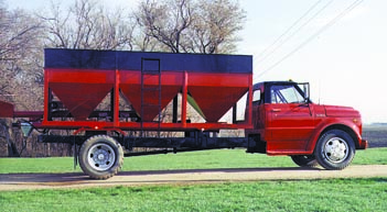 Gary Stienessen, Taunton, Minn., built a 3-hopper bulk seed handler that mounts on his Chevy C-50 2-ton truck. The entire unit is 15 ft. long and attaches with four bolts, allowing it to also be mounted on a wagon running gear or goose-neck trailer. Each hopper holds 60 bu. A brush auger runs under the three hoppers to the back of the truck, where a second brush auger can be swung out and up for filling planters and drills. An electronic digital weigh scale on back allows Stienessen to weigh seed as it's loaded or unloaded. "It lets me carry three different kinds of seed at once. It also can be used for other operations. For example, I can use it as a weigh wagon during harvest. I also use it to haul feed to my cattle. The weigh scale really comes in handy for figuring lbs. per acre during planting," says Stienessen.
