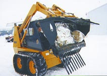 "It has just one moving part and does a great job of picking up rocks, especially in fields with a lot of trash," says Larry Omann, St. Joseph, Minn., inventor of a new-style rock bucket with tines that mechanically flip rocks back into the bucket. No extra hydraulics are needed to power the rock forks. Omann says his patented "PikRite", as he calls it, picks up rocks ranging from 1 in. dia. and up. He developed the new rock picker for his own use to mount on any skid steer loader. It worked so well he's now looking for a manufacturer. The 6-ft. wide quick-tach rock bucket has evenly spaced teeth across the front lip that scoop rocks out of the ground, letting dirt and trash drop out as the rocks slide onto the teeth. The teeth pivot up on an enclosed steel shaft. Once the rock is on the tines he lowers the bucket until a "knee" lever hits the ground, then backs up. The lever digs into the ground, turning the tines up and flipping the rock back into the bucket. Driving forward again automatically resets the tines. "I can flip rocks back one at a time into the bucket or gather several at a time on the tines and then dump them all at once," says Omann. "The speed in reverse determines how far back the rock is flipped into the bucket. Rocks are held in the bucket by the housing over the front shaft. As a result, I can dig out rocks even with a full bucket. To dump the rocks I simply tilt the bucket all the way down and shake it. "Skid steer loaders are so much more maneuverable than a tractor that I can clear a field with this rig in a fraction of the time of most other rock pickers. The rock bucket could also be fitted to a tractor or garden tractor as long as the operator has a good view of the bucket. Each tooth clamps on with one bolt. By loosening all the bolts I can move the teeth over in order to pick up even the smallest rocks. "My neighbors Eugene and Joe Huls let me use their Case skid steer loader to test the unit." Omann says he's made five different models for small and big skid steer loaders. One model is equipped with a 5-ft. bucket and 2-ft. long coiled Danish teeth. He's also made a model that can be bolted onto an existing bucket. And he has experimented with buckets that have slotted floors to let more dirt and trash fall through. He's now testing a spring tooth model. It pressures the rock out of the ground and won't dig out rocks over 2 ft. in diameter. If a tine bends it can easily be straightened using an 8-ft. long steel pipe.