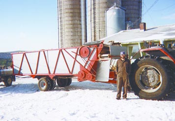 "There's nothing like it on the market. We can mix up two different rations at once and feed two or more groups of cattle in one trip," says Joel Pominville about the precision mixer wagon he built from scratch. The two-compartment wagon is 7 ft. wide by 21 ft. long with 7 1/2 ft. tall sides. It'll handle a total of 7 tons of feed. It was built out of square steel tubing covered with ply-wood. The axles were fabricated at a local ma-chine shop and are fitted with dual wheels, rims and 16-in. tires off an old Badger for-age wagon. The apron chains and elevator chains in each compartment run independently. Home-built beaters turn on 2 in. dia. solid shafts and Browning gears, chain- driven by pto. He uses an apron chain across the front of the wagon to deliver feed to stalls in his free stall barn. The feed drops into stalls via a rubber truck mud flap mounted directly under the mouth of the cross auger. Pominville typically first loads hay into both compartments, front to back. He next adds corn silage, then grain and minerals on top of the silage. The amount of grain depends on which group of cows is being fed first. For example, up to 20 lbs. of grain per cow is used in one compartment for his high-producing group. The apron chains pull material to the front to the elevator chains which bring the bottom material to the top. The beaters located just behind the elevators mix it all up. His four groups of cows, totaling 200, are fed about half of each compartment twice daily. "It works like a charm," Pominville says. "The elevator chains and beaters are the keys to success. The elevator chains tumble the feed to mix it and the beaters work the grain in for a precisely mixed ration."