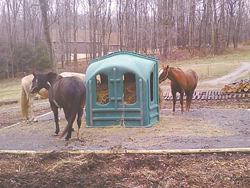 Thornton and his wife Jean appreciate any reduction in hay cost and labor when it comes to the large Palomino Warmbloods they raise on their Florida farm. The Hay Hut design reflects their real "horse-world" experience. The 8 large (14 by 34-in.) openings, two on each side, provide horses easy access to hay while offering a reassuringly clear view of the area. There are no bars or hoops for horses to negotiate or get caught in, and the rolled edges prevent mane breakage. The multiple access points also prevent an 'alpha' animal from dominating the hay supply.
