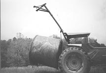 Welding wire cattle panels to round bale feeders saves a lot of hay, says Robert Schum, Saint Meinrad, Ind., who modifies conventional round bale feed racks by welding 54-in. high wire panels onto the feeder rings and slanted bars. "I have 20 of these modified bale racks on my cow-calf operation and they work great," says Schum. "I came up with the idea because I couldn't stand seeing hay go to waste. The wire panel extends 12 to 14 in. above the top ring. Cattle can't reach over the top of the wire panels and pull hay out like they can with the original feeder." He starts out with standard 44-in. high, 8-ft. dia. steel feeders. He then tach welds the 16-ft. long, 54-in. high galvanized wire panel to the outside of the ring. He cuts out some of the wire panel between the slanted bars to leave two openings at each end of the bale that go all the way down to the ground. The full length opening keeps calves from getting their legs caught on anything when they step into the feeder. "The wire panel design saves at least three fourths of the hay that would otherwise be wasted," says Schum. "One reason is that there are only four openings. The fewer openings, the less waste. The cattle don't have to all eat at one time but instead can take turns. I buy Red Brand heavy duty panels with 1/4-in. thick wires. It's a waste of money to buy cheaper panels with thinner wire. It's important to have six wires at the top spaced only 2 in. apart because they give the top of the feeder a lot of strength. It takes 25 ft. and 4 in. of panels to completely encircle the feeder. I overlap the panel ends 2 in. and then weld them together. "The middle ring is 16 1/2 in. from the ground. I think that if it was higher -- say 23 in. or so -- it would save even more hay." Schum made a 3-pt. boom that lets him lift the rack up by the top ring and lower it over the bale without ever leaving the tractor seat. The end of the boom is equipped with a triangle-shaped attachment and channel iron "catch brackets". The boom is raised or lowered by a 32-in. hydraulic cylinder and can be adjusted to a length of 8 ft. The back end of the boom mounts on a steel bracket that's clamped onto the tractor's rollbar. The bracket allows the boom to pivot up or down.
