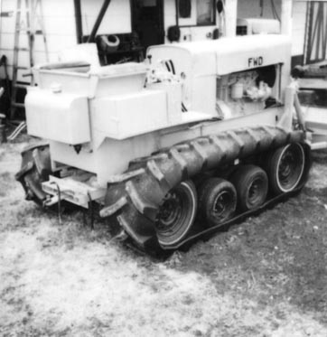 "It's as big as a D-4 Caterpillar and will crawl over almost anything," says Adamson, who used 18.4 by 38 rear tractor tires to make rubber tracks for the tractor. The tracks have 7 1/2 ft. of surface contact with the ground and ride on 4 pairs of dual wheels on each side for a total of 16. The front and rear dual wheels on each side are 13-in. car tires and the center wheels are smaller.