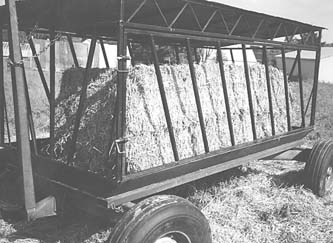 A Wisconsin farmer who wanted to reduce feed waste with big square bales built his own feeder for them, complete with roof, on an old wagon chassis.