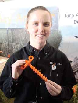 If you've been looking for a better way to anchor big hay tarps, you'll like this new product we spotted at the World Ag Expo in Tulare, Calif. Hay Anchors are 7 1/2-in. long polypropylene screws that hold tightly in any type of bale to secure tarps. Hay Anchors have a 3/4-in. hex head and two handles, so you can use a speed or impact wrench to insert the anchor or simply screw it in by hand. Once placed, they provide a solid anchor for bungee hooks or other tie-downs. Hay Anchors have other uses, too. "Customers have used them for everything from tree stakes to tent and tarp stakes in the ground," says Ashley Royals, General Manager of the Colorado-based company, noting that non-hay uses are not covered under the warranty. The compact, reusable anchors have no metal parts so they won't rust or deteriorate, and their bright orange color makes them easy to see. They have "cupped" threads that provide extreme holding power in hay and the product has been tested in 80 mph winds. Hay Anchors come with a 3-year warranty, and discounts available for bulk orders of 50 or more.