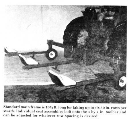 It mounts on the rear of a tractor and fits Category II or III 3-pt. hitch, or Category II quick coupler. The 4-in. square main frame raises with the tractor hitch. Adjustable gauge wheels maintain the desired operating height for the riders.