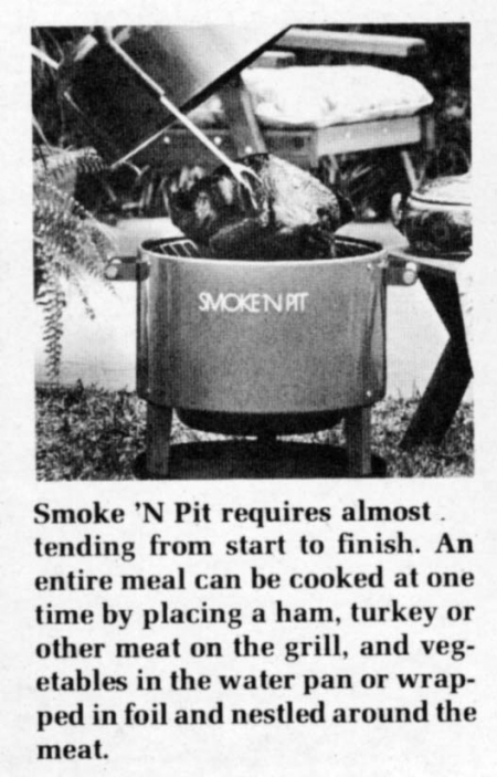 The latest new development in patio or outdoor cooking is the Smoke 'N Pit charcoal water smoker. It uses moisture, charcoal heat and smoke from aromatic hardwoods to cook meats and other foods "to a degree of tenderness and delicious flavor not possible with conventional cooking grills," says the manufacturer.