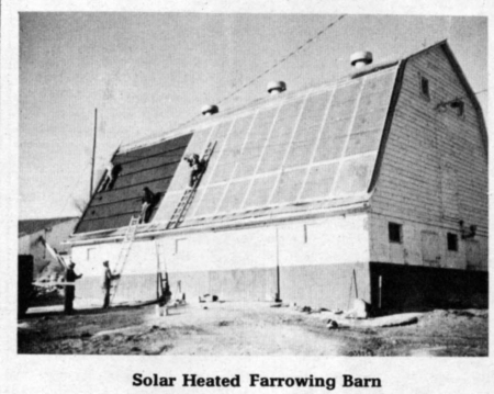 The 17 by 50-ft. roof is equipped with a flat plate solar collector which William Peterson, agricultural engineer at South Dakota State University, Brookings, helped design. Here, according to a report in the Small Farm Energy Project Newsletter, are other details of the installation: The metal roof was painted black to serve as the heat collecting surface. Translucent corrugated fiberglass was attached to the roof/collector surface with 2 by 2-in. boards extending the length of the roof at 2-ft. intervals. The 2 by 2-in. strips also serve as separations for 6 air ducts which air follows as it is drawn through the collector. Redwood strips that match the corrugations of the sheet metal and fiberglass were sealed with silicone caulk to minimize air leaks in the collector.