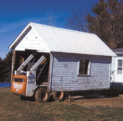 This 1800's, 10 by 14-ft. outbuilding had to be moved in order to make room for a new attached garage on our farm. I asked my son to use his Bobcat skid loader to lift off the roof and was standing outside the house with my camera ready.