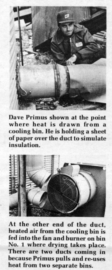 With the fuel-saver in use, Primus says he can dry 2,000 bu. in 24 hrs. taking out 10 points of moisture -- not bad for an in-bin system! "Corn is dryed in the first bin, transferred hot to a second bin, then a fan pulls air through the dry, hot grain and a duct carries it to the burner and fan on the first bin," he told FARM SHOW.