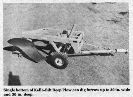 The latest new way to break up "hard pan" and problem soils is with a Kello-Bilt Deep-Plow. This rugged plow is specifically designed to turn and mix solonetzic soil with top soil for improved crop growing conditions. It has a 21-in. share and, depending on soil conditions and power available, can cut a furrow from 21 to 30 in. wide and 20 to 30 in. deep.