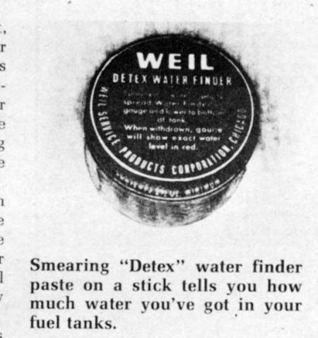 Just smear Weil Products' green Detex paste on the end of a gauge pole and slip it into your tank. The paste turns red in water and, since water settles to the bottom in gas or diesel fuel, you can measure exactly how much water is in the tank.