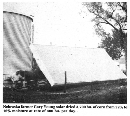 Young dried his entire corn crop with the solar collector last fall. He had about 3,700 bu. averaging 22% moisture which he dried to 16% at a rate of about 400 bu. per day.