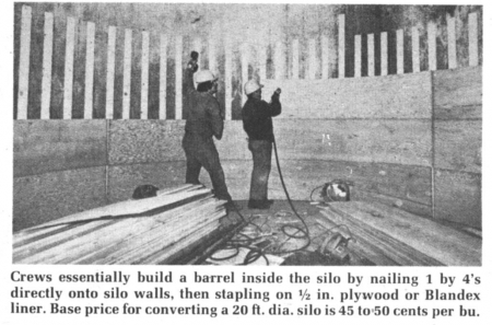 "We create a 1-in. air space by nailing 1 by 4's directly to the silo walls, spaced 6 in. apart and running vertically. We then staple 1/4-in. plywood or Blandex sheets to the 1 by 4's covering the entire inside. In effect, we're building a barrel inside the silo."