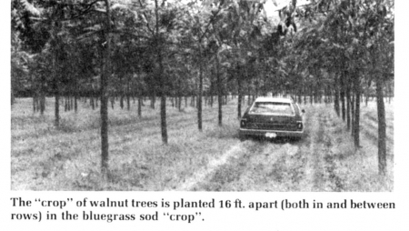 The walnut trees have been phased into the program for the last 10 years. They're planted 16 ft. apart in 16-ft. rows in the bluegrass fields. The 16-ft. spacing allows fertilizer spreaders and sod cutting machinery to work between the young trees. When the trees get tall and the crowns close in over the row, the sod operation must be phased out because tree roots will be damaged.