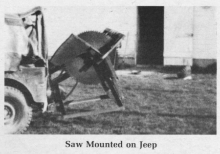This saw, mounted on a Jeep, was built in a local welding shop in the late 40's in the days when a welder in a farm shop was the exception instead of the rule.