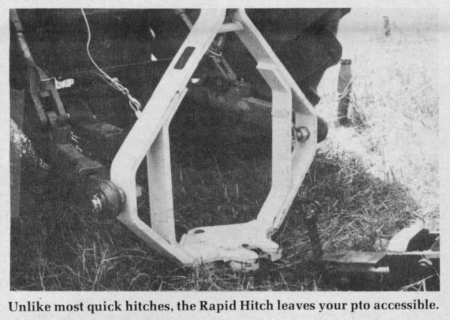 "Rapid Hitch" is an automatic 3-pt. hitch with a unique open center system that lets you use your pto equipment without having to remove the hitch or switch tractors.