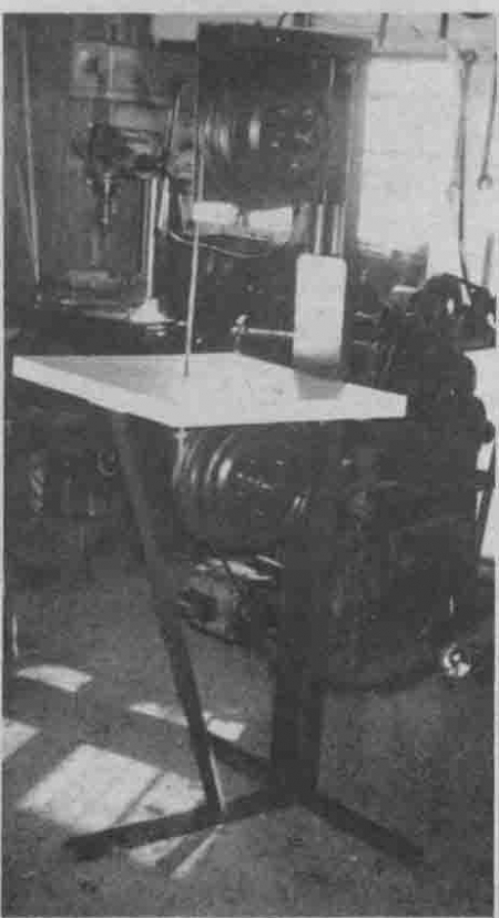 Van De Walle's first step was to build a stand with the channel iron that would hold the two drums, the 1/2 hp motor that powers the saw, and a cutting table. Each of the brake drums, which he salvaged at a junkyard, has a 6-in. shaft in the center that would ordinarily have fastened to a car axle. He bolted this shaft to heavy flat iron plates which are welded to the channel iron. The motor is mounted below the bottom drum and a belt running from the motor to the drum provides the power.