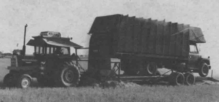 The high-sided truck was specially built. The top half of the endgate pivots out and rests over the Stakhand chute, helping direct chaff into the truck. Peter notes that the chute fit right into the end of the truck so that no modification was needed. The endgate also hinges at the side for unloading.